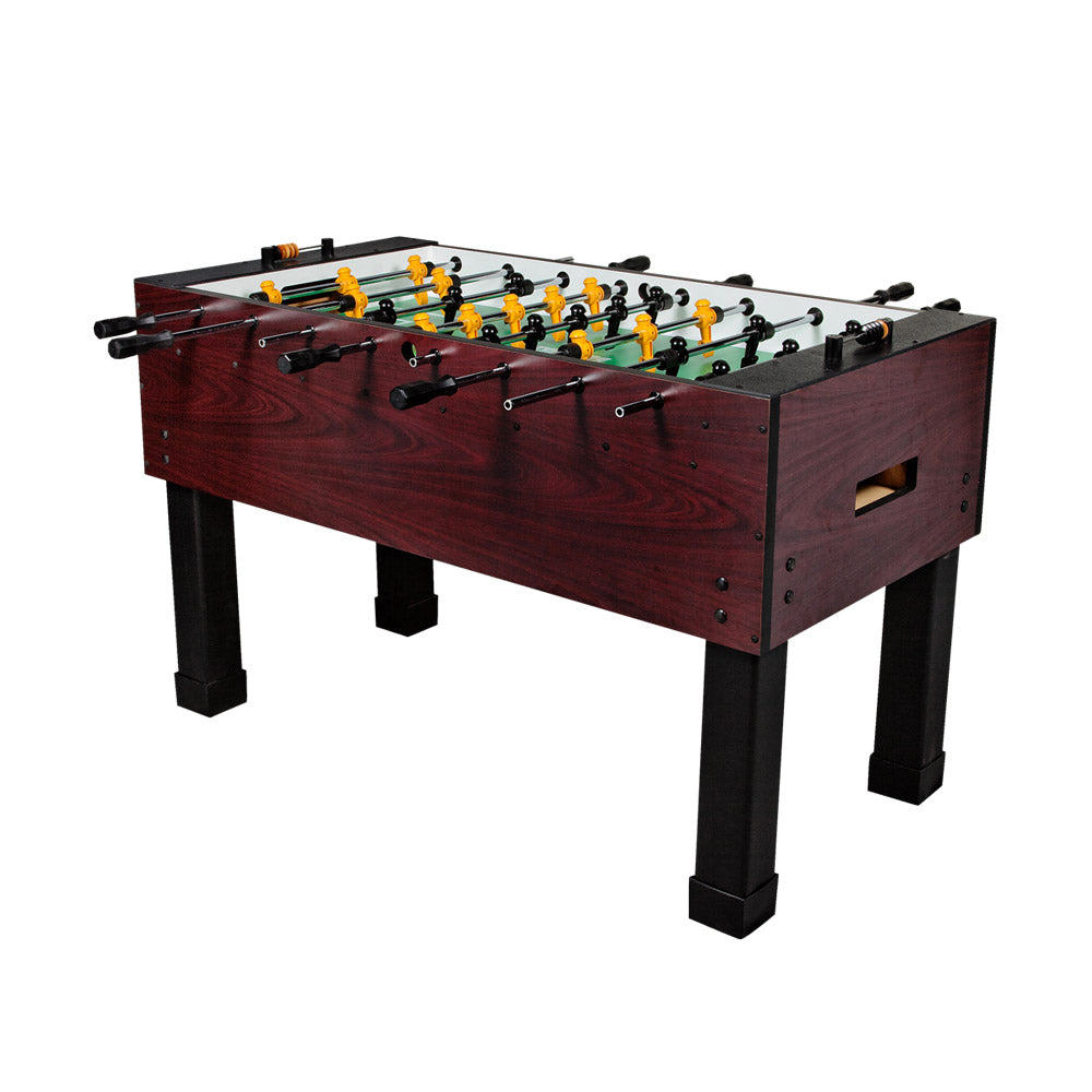 The Tornado Sport Foosball Table is a great starter table with a Mahogany Melamine laminate finish covering the 1" thick cabinet. This table meets the same qualities of the rest of the Tornado line with heavy-duty laminate, easy-adjust levelers, durable rods, and counter-balanced low profile players. This table is perfect for casual games, beginners, children, and anyone learning to play foosball.
